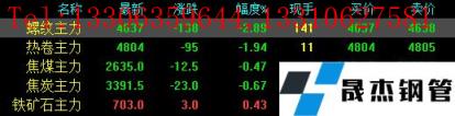 今日螺紋主力期貨跌138,收報4637,跌幅2.89%;熱卷主力跌95,收報4804,跌幅1.94%;焦煤主力跌12.5,收報2635,跌幅0.47%;焦炭主力跌23,收報3391.5,跌幅0.67%;鐵礦石主力漲3,收報703,漲幅0.43%。