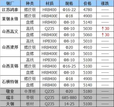 22日武安新興鑄管最新執行價:廢鋼I類3490,廢鋼Ⅱ類3550,廢鋼Ⅳ類3600;馬蹄鐵3630,工角槽3630,花鐵壓塊3600,船板料壓塊3490,鋼筋壓塊3600,模板壓塊(塔吊)3600,不含稅,單位:元/噸。